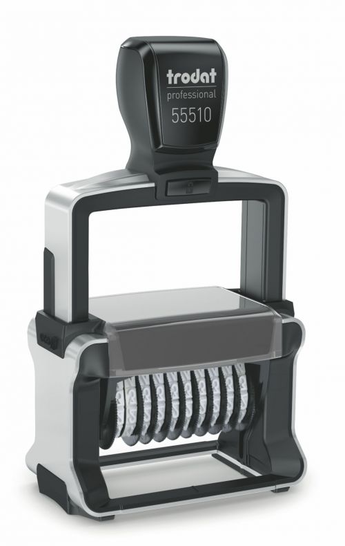 The Trodat Professional 55510/PL numbering stamp can be customised with four lines of text to make your imprint unique to your business while ensuring organised paperwork. Featuring a brushed stainless steel frame and an ergonomic design, the stamp is suitable for heavy duty use while minimising repetitive strain during prolonged use. A positioning window gives you an accurate size and precision before your application, whether it’s documents, packaging, craft projects or on promotional flyers. An imprint size of 54 x 31 mm allows for four lines of text, two above and two below the band, provides you the opportunity to customise the design. The stamp features 10 bands, 5 mm in height, each featuring numbers 0 to 9, plus the first band has additional characters such as #, %, € and many more. The 6/56 replacement pads in black, red, blue, green and violet are available to help further extend the use of your stamp imprint, so there is no need to buy a new stamp, helping you save on cost. Smooth action, durable and designed by you, the Trodat Professional 55510/PL will become a mainstay of your daily routine at work.