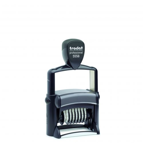 The Trodat Professional 5558/PL numbering stamp can be customised with four lines of text to make your imprint unique to your business while ensuring organised paperwork. Featuring a brushed stainless steel frame and an ergonomic design, the stamp is suitable for heavy duty use while minimising repetitive strain during prolonged use. A positioning window gives you an accurate size and precision before your application, whether it’s documents, packaging, craft projects or on promotional flyers. An imprint size of 56 x 32 mm allows for four lines of text, two above and two below the band, provides you the opportunity to customise the design. The stamp features 8 bands, 5 mm in height, each featuring numbers 0 to 9, plus the first band has additional characters such as #, %, € and many more. The 6/56 replacement pads in black, red, blue, green and violet are available to help further extend the use of your stamp imprint, so there is no need to buy a new stamp, helping you save on cost. Smooth action, durable and designed by you, the Trodat Professional 5558/PL will become a mainstay of your daily routine at work.