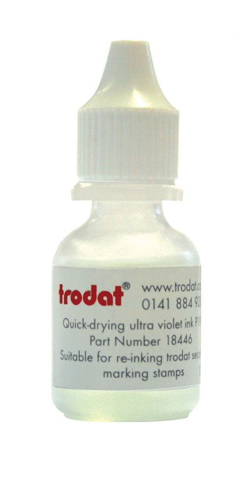 This quick drying ink is specially designed to be invisible to the naked eye and can only be seen using an Ultra Violet light. Simply add to an unused dry ink pad or re-ink a pad that has been previously used for the same application and your imprint will last for years to come.