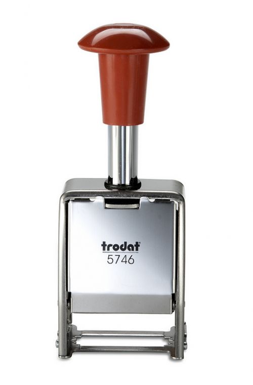 A Trodat self-inking metal automatic numberer that is ideal for a number of uses, including coding and recording stock levels in shops and warehouses. The imprint is 6 numbers long, with each band containing numbers 0-9. 4.5mm character imprint size in roman font.